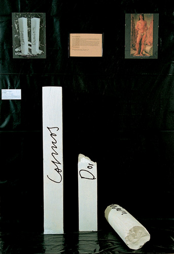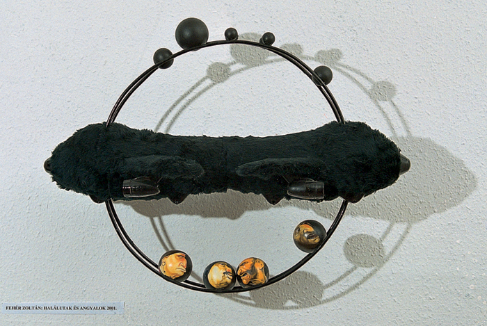 A kiállítás előtti napokban, azaz az utolsó pillanatban, egy plussz installációval is kiegészítettem a saját anyagomat, mivel épp az alkotási folyamat kellős közepén történt meg a New York-i tragédia, ami – figyelembe véve a kiállítás mottójául választott, ismert Napoleon Boulvard szám címét is – igencsak abszurd asszociációkra ragadtatott, tehát szükségét éreztem az arra való reakciónak is. A fekete szőrmével borított műanyag repülőim és az azt kiegészítő, festett, Bosch-parafrázisként hintázó fagolyó-portréim mellé – mely a „Halálutak és angyalok" címet viselte –, Joseph Beuys egy korábbi manipulált fotójára és egy reneszánsz művész, Liberale da Verona Sebestyén képére „hajazva", gipsz-torony-öntvényeket készítettem. Ezek – két reprodukcióval és egy Szent Kozmáról és Damjánról szóló, kiegészítő szöveggel – alkották végül a kiállítás címével is megegyező installációm egészét.